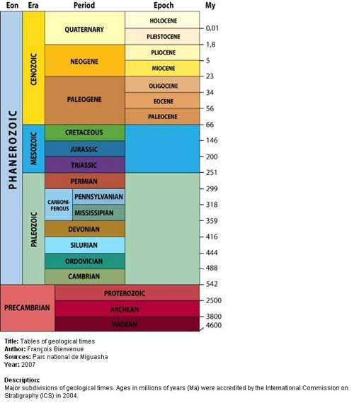 Bütün bu məlumatların əldə edilməsində fosillər əhəmiyyətli rol oynamışdı. Bu gün hələ də istifadə edilən Kembriyə qədərki (Arxey və Proterozoy eraları) dövrdən IV dövrə qədər geoloji dövr cədvəli fosil yataqlarının və süxur quruluşlarının işarə etdiyi məlumatlardan istifadə edilərək hazırlanmışdır. Süxurlar üzərində aparılan tədqiqatlar nəticəsində yer üzünün hansı dövrlərdə hansı mərhələlərdən keçdiyi müəyyən edilmiş, süxurlardakı fosillər sayəsində isə müxtəlif dövrlərdə yaşayan canlılar haqqında məlumat əldə edilmişdir. Bu iki məlumat birləşdirilərək cədvəl tərtib edilmişdir. Bu cədvələ görə yer qabığının tarixi eonlara, eonlar eralara, eralar da dövrlərə bölünür.